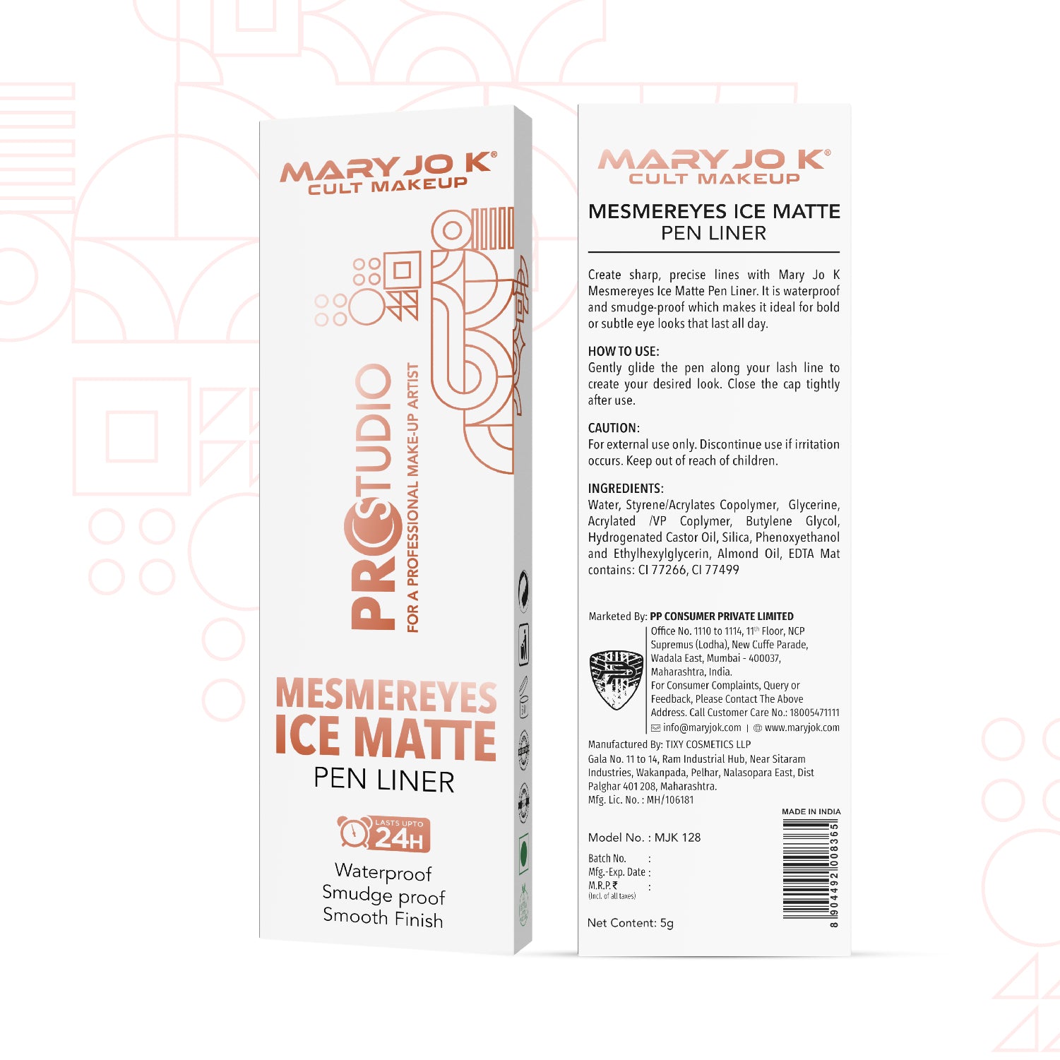 Meet your new go-to for flawless eye definition, Mary Jo K Mesmereyes Pen Liner. Designed with a slim, flexible tip, it gives you full control to draw everything from fine lines to bold wings with ease. The rich, black formula dries quickly and stays put, no smudging, fading, or flaking. It’s water-resistant, lightweight, and comfortable for all-day wear. Available in two mesmerising variants: High Shine and Ice Matte.
