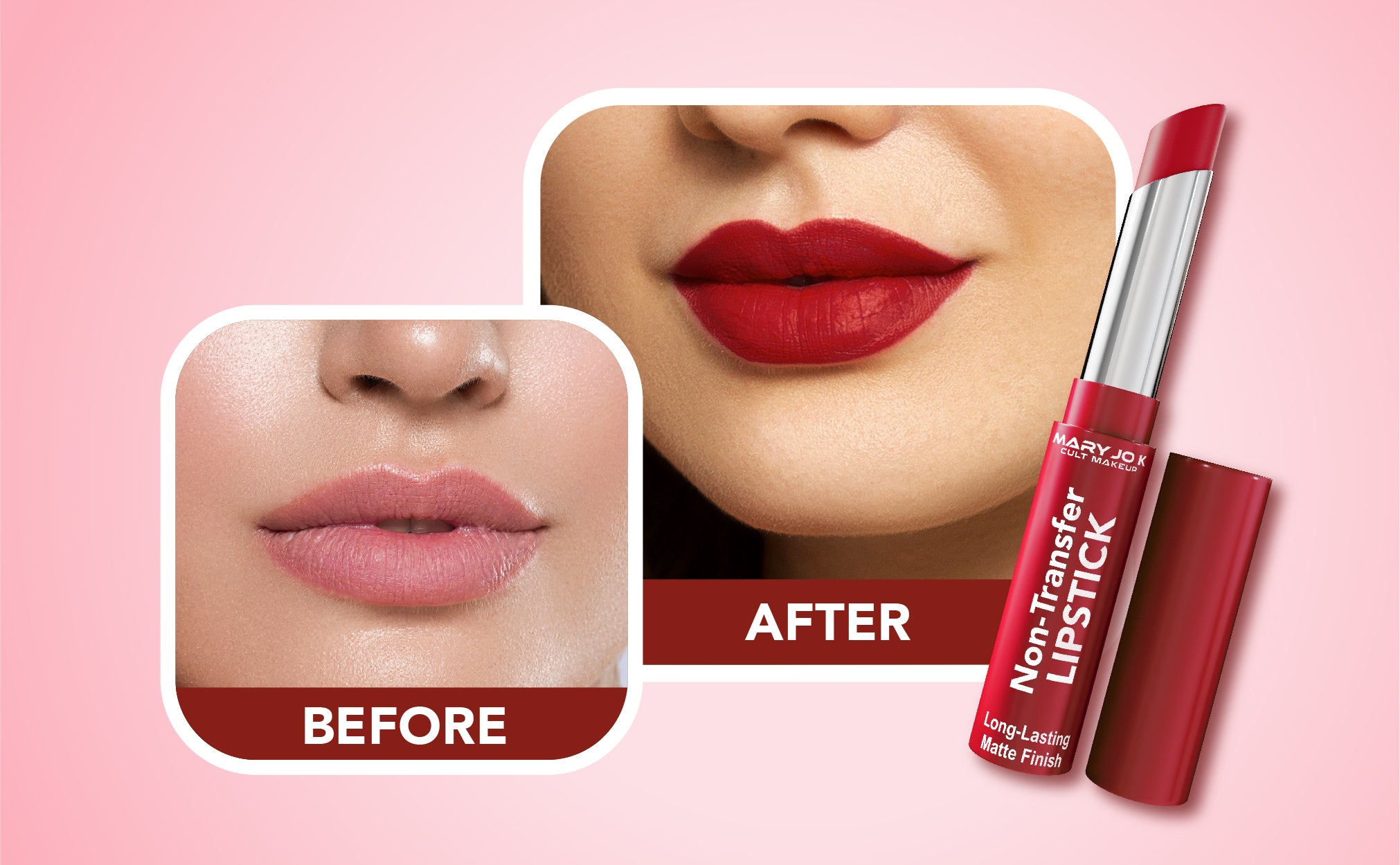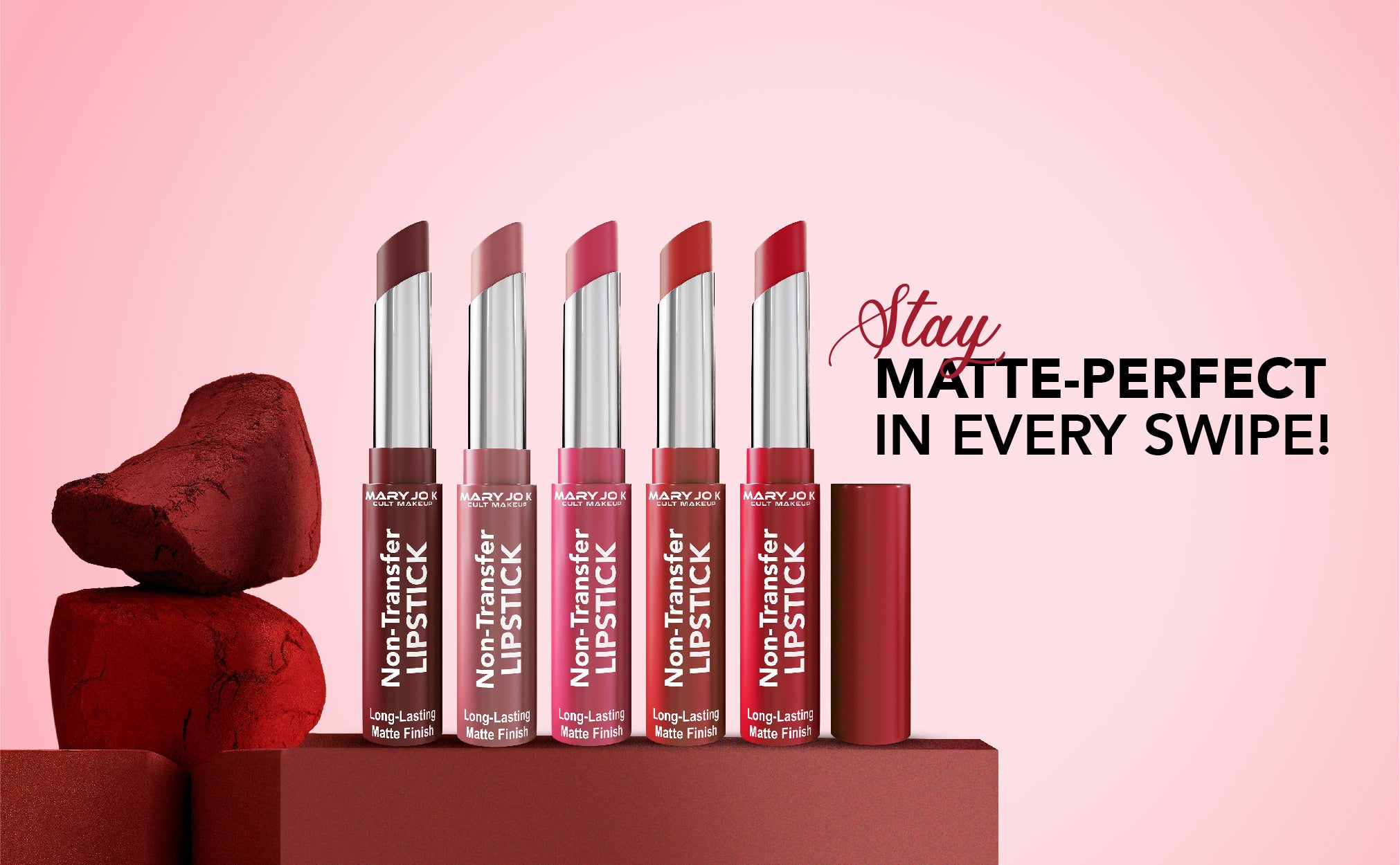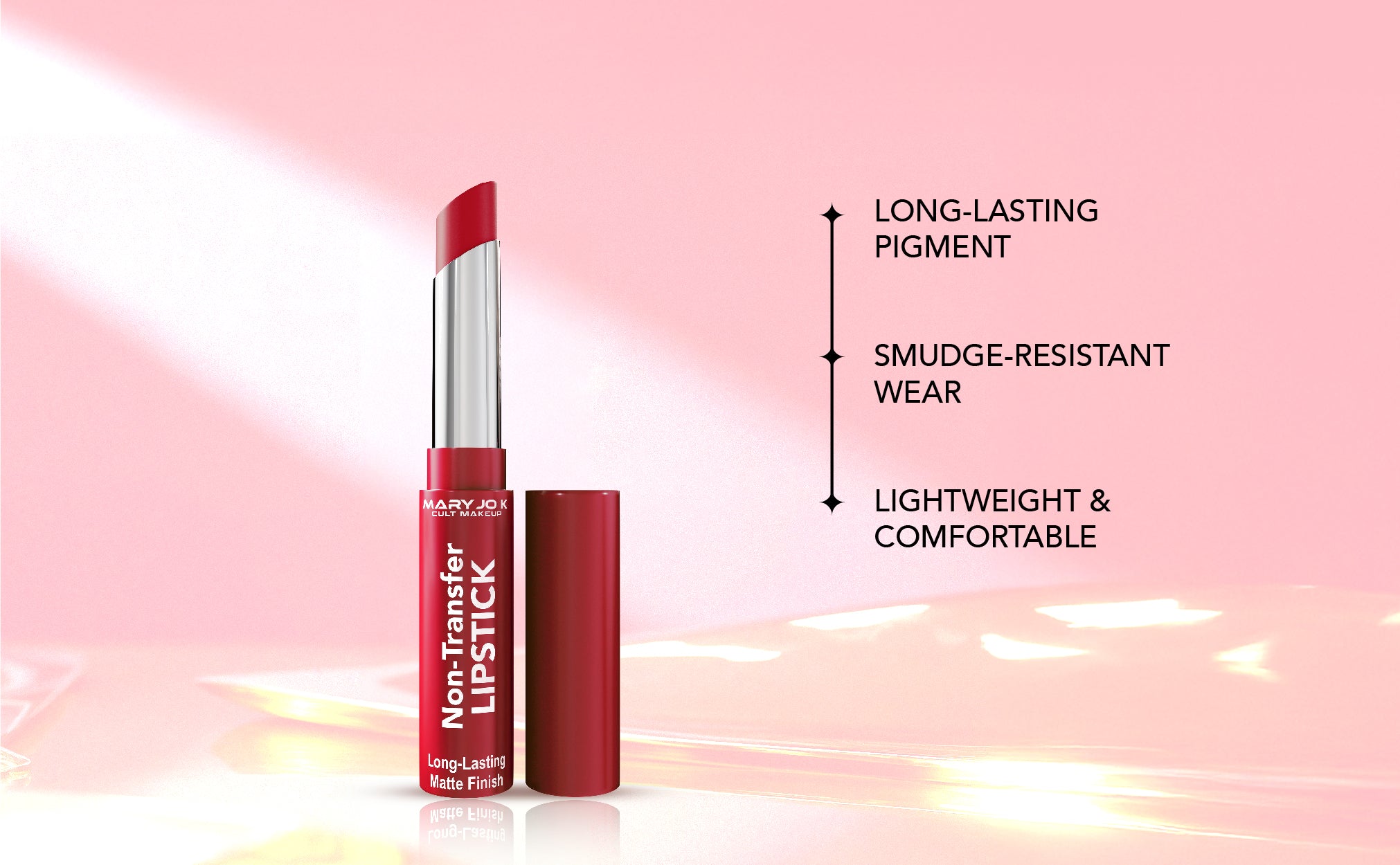 Say goodbye to smudges and hello to flawless colour with Mary Jo K’s Non-Transfer Lipstick. This long-lasting non-transfer lipstick is specially formulated to stay put for hours, delivering rich, intense pigment without fading or leaving marks. Its smooth, non-transfer matte lipstick formula glides on effortlessly, keeping your lips comfortable, bold, and perfectly defined all day long.
